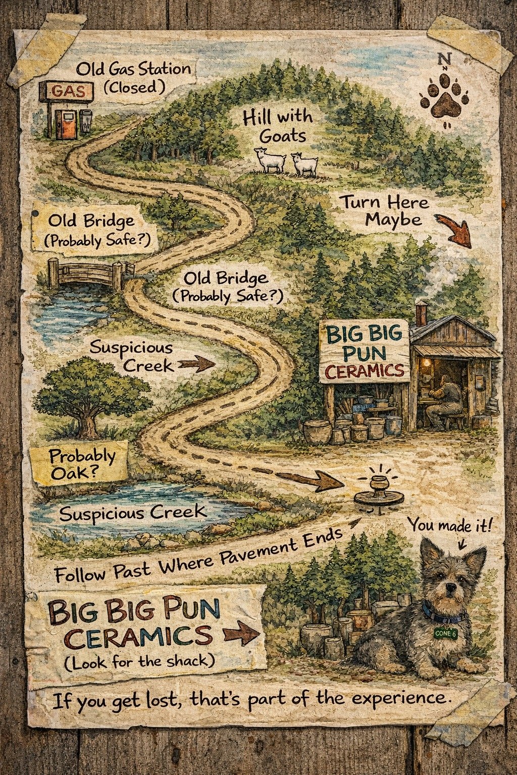 You’ll find us in a place that looks less like a destination and more like something that happened. Smoke in the air. Shelves of questionable decisions drying in public. Objects that may or may not hold water.
